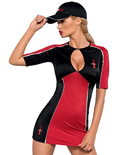 Inflaming senses 3-piece Rally costume by Obsessive with decolletage. This set consists of black&red dress adorned with silver trimming, black sexy thong and black cap with red embroidery.Under the neck there is a fastener with Obsessive logo. The dress is adorned with two rally badges. The rear is black and smooth without any adornments. The dress has deep-cut neckline. Very flexible material - 88% Polyester and 12% Elastane.