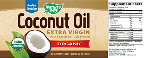 Nature's Way Organic Extra Virgin Coconut Oil is a natural energy source because it contains MCTs (medium chain) “good fats” the body uses to produce energy. As a dietary supplement, Coconut oil is a good addition to physical activity, exercise and weight loss programs.The Nature's Way Organic Extra Virgin Coconut Oil is certified Organic, Non-GMO, Pure extra virgin, has Zero trans fat and Zero hydrogenated fat. Coconut oil can be taken as a dietary supplement, used for cooking or used for skin & hair care.