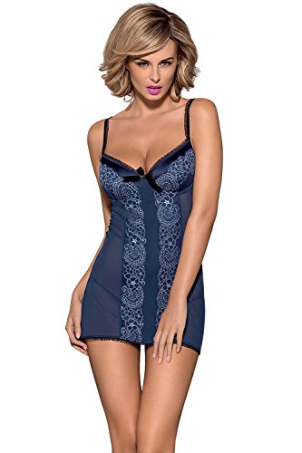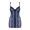 Sexy, feminine and cute chemise Auroria by Obsessive.Let this night be gorgeous and special.This is delicate chemise in tasty berry blue colour with adjustable straps which guarantee perfect fit.It has underwired cups made out of satin fabric with lacy adornment, tiny bow adds plenty of charm. The chemise is edged with tucked, black trimming.Chemise has also vertical pattern which optically slim the silhouette.Made with delicate mesh and elastic fabric.Matching thong included.