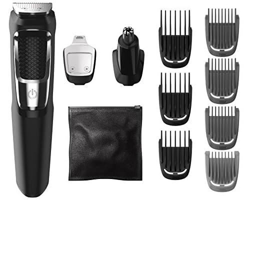 The Philips Norelco Multigroom 3000 is an all-in-one trimmer with everything you need, and nothing you don't. Our toughest multipurpose trimmer boasts tempered steel cutting blades that self-sharpen and won't rust.The trimmer includes 13 pieces to trim your face and head, including a full-size steel trimmer, steel detailer, nose and ear trimmer, 3 hair cutting guards, 3 beard trimming guards, 1 stubble trimming guard, and a storage bag.