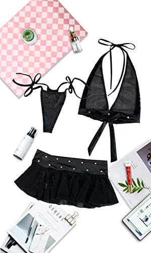SoulBuds 3pcs Lingerie Set - Top, Mini Skirt, G-String (Black): This super stunning gorgeous and delightful lingerie will spice up your relationship with your lover.Made of comfy elasticity solid see through sheer mesh and comfortable imitation fabric.