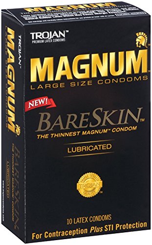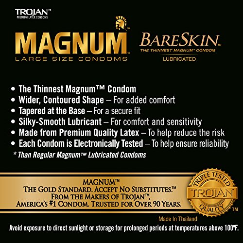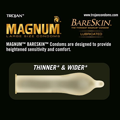 The Trojan Magnum Bareskin Large Size Condoms are designed to provide heightened sensitivity and comfort. Magnum Bareskin Condoms are 20% thinner and 18% wider toward the tip than regular MAGNUM lubricated condoms.