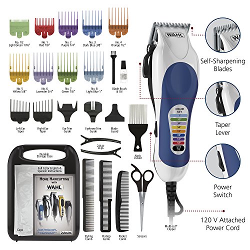 The Wahl Color Pro Hair Clipper Kit makes home haircutting quick and easy with the color coded guide. Simply match the color of the guide comb with the color on the color key to determine the perfect cutting length.The colors also make it easy to remember your correct guide comb size every time you cut. Choose any of the Wahl Color Pro Hair Clipper Kit's 14 guide combs for even cutting lengths.